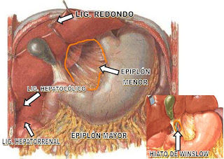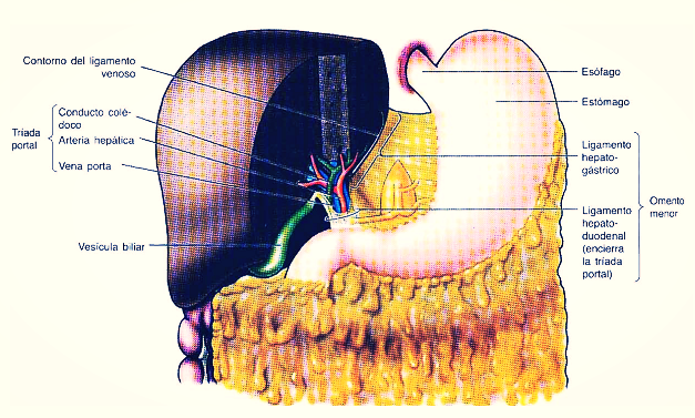 - Estomago: Mediante el Ligamento Hepatogástrico.