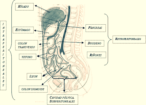 entre el peritoneo parietal y la pared posterior del abdomen. Por ejemplo: